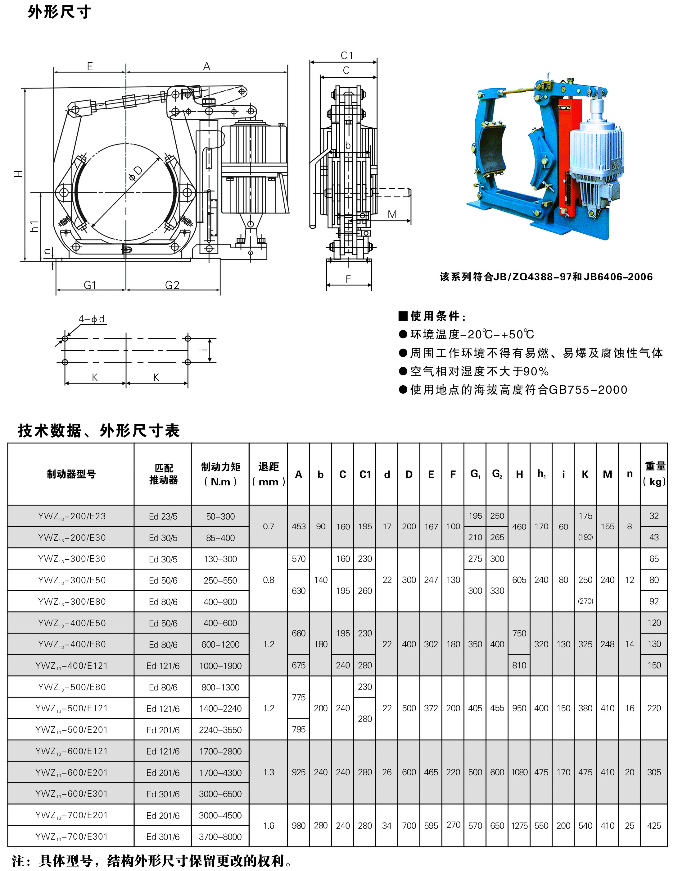 制動器安裝尺寸和制動力矩參數(shù):JB/ZQ4388-97標準,技術要求符合JB/T6406-2006標準。