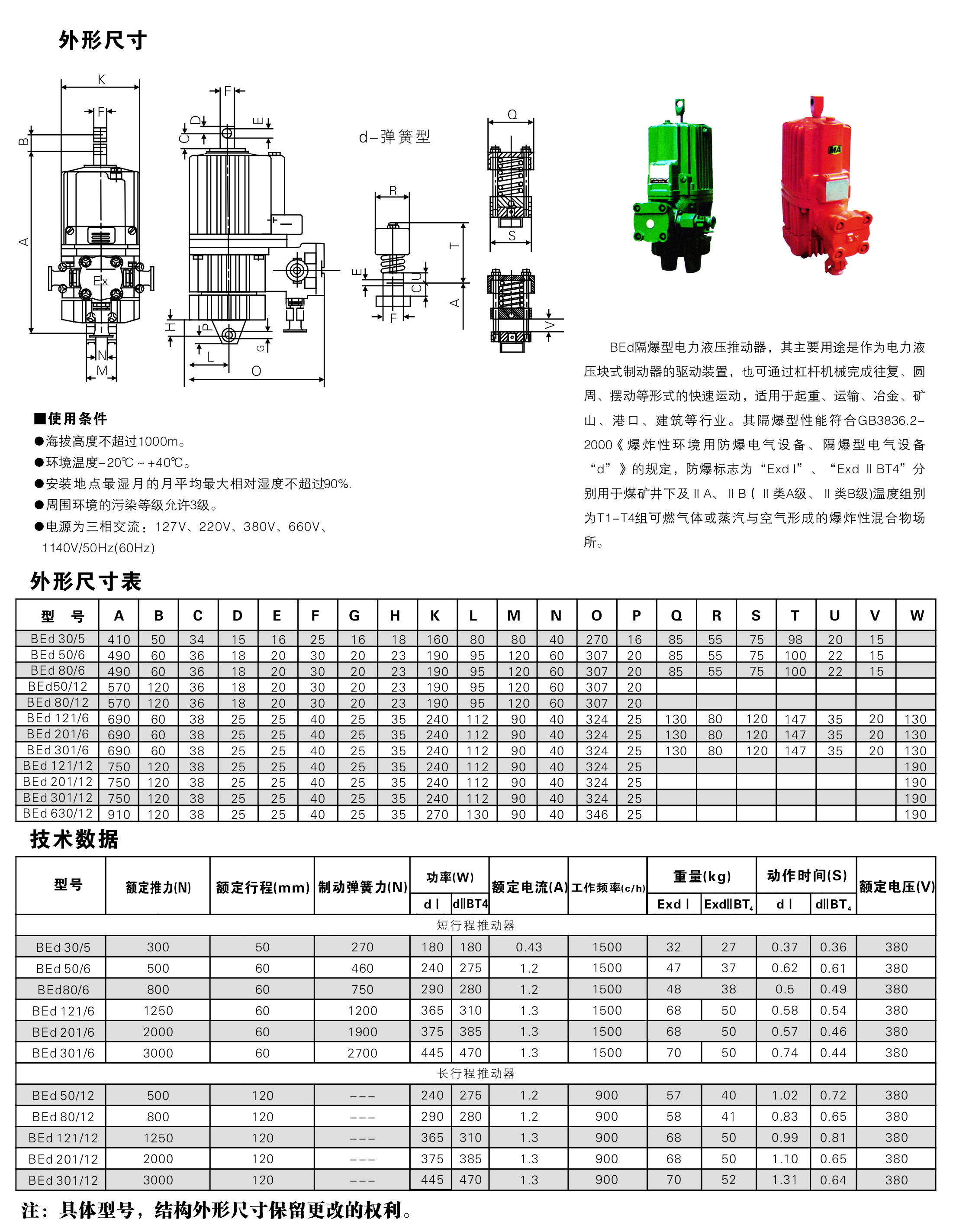 BEd系列隔爆型推動(dòng)器' >電力液壓推動(dòng)器是一種集電機(jī),離心泵,油缸為一體的,結(jié)構(gòu)非常緊湊的驅(qū)動(dòng)控制裝置,被廣泛用作各種塊式制動(dòng)器和盤式制動(dòng)器的驅(qū)動(dòng)裝置,還可用于各種工業(yè)閥門,閘門,定向擺動(dòng)和轉(zhuǎn)動(dòng)(<90°)裝置(機(jī)構(gòu))及夾緊裝置的驅(qū)動(dòng)控制。