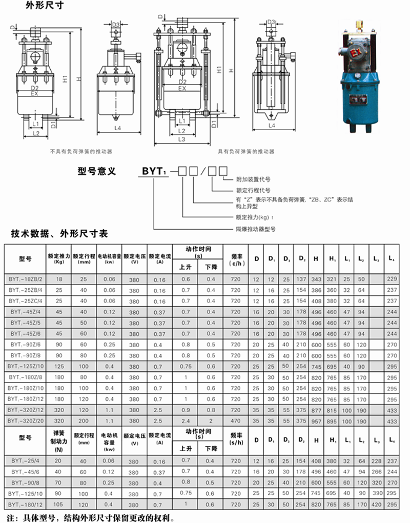 BYT1推動器' >電力液壓推動器隔爆型主要用于YWZ系列操動閘瓦式制動器,作為起重、運(yùn)輸、行車等一切類似驅(qū)動裝置的機(jī)械制動用。